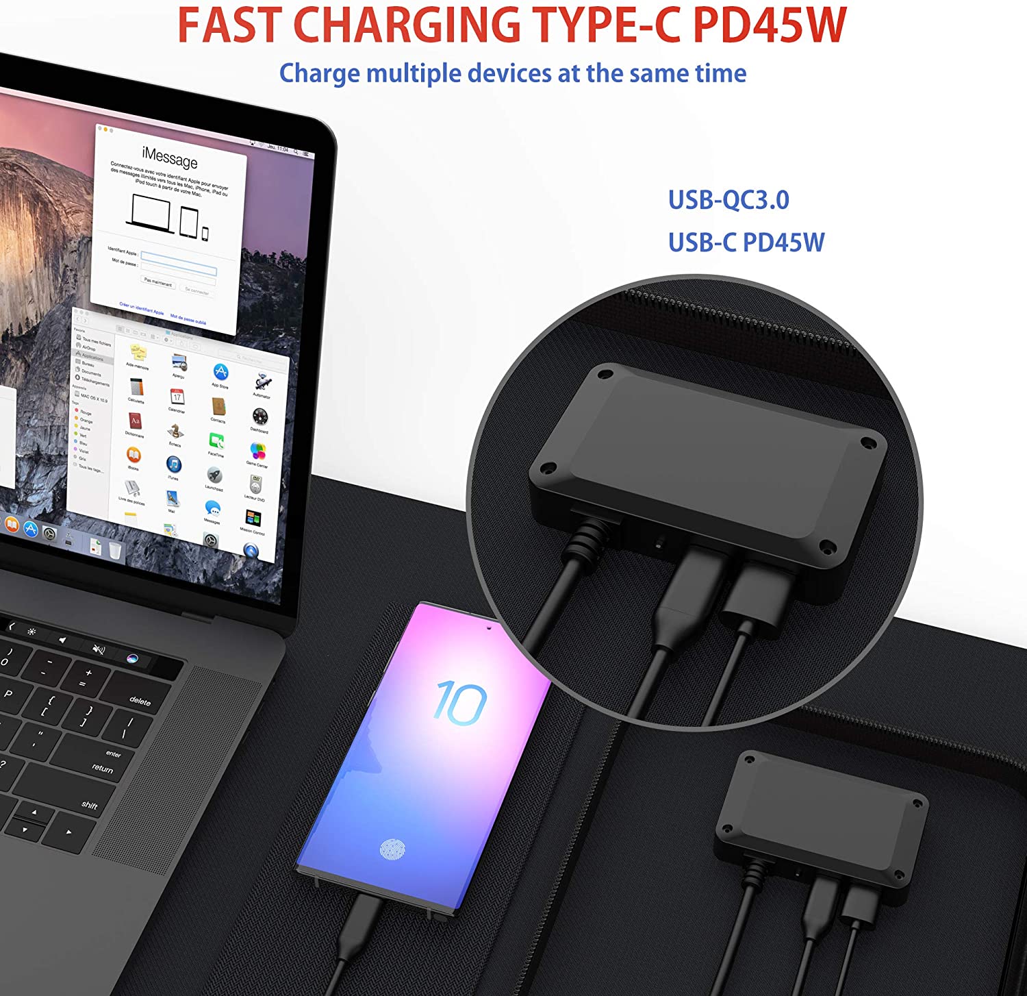 Built-in a DC cable plus extral 10 DC ports and the DC5521 to Anderson/ XT60/ 8020 cable support most of the portable power stations; Type-C PD45W / USB QC3.0 can quickly charge your smartphone, laptop, tablets, ipad, GPS, USB fan, camera or other USB devices at the same time